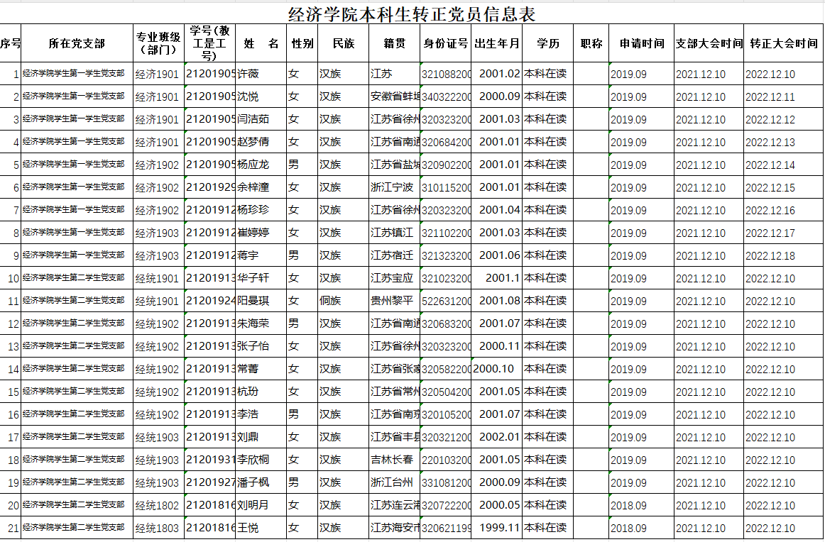 在听取党小组和党员、群众意见的基础上,经支部委员会审查同意,近期将召开本科生支部大会,拟同意许薇等21名同志转为中共正式党员。根据发展党员工作有关要求,现将其有关情况公示如下: