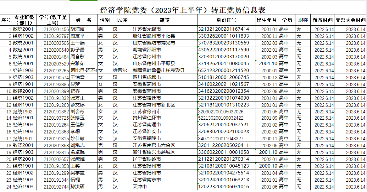 在听取党小组和党员、群众意见的基础上,经支部委员会审查同意,近期将召开本科生支部大会,拟同意胡海波等24名同志转为中共正式党员。根据发展党员工作有关要求,现将其有关情况公示如下:
