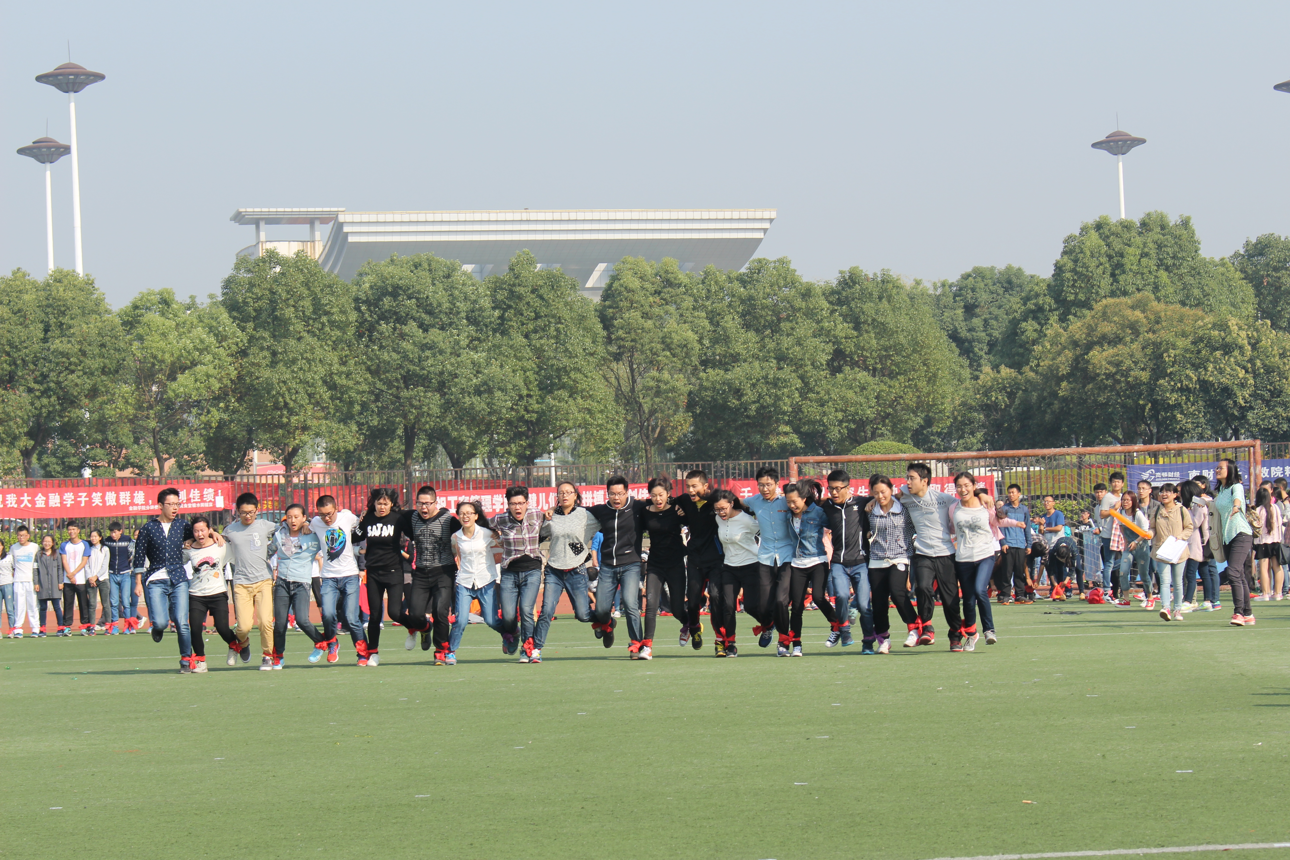 英姿飒爽,沙场秋点兵;笑傲赛场,青春显活力。红色的跑道上,刘源同学迅速调整状态,采取“稳中求进,最后冲刺”的策略,奔跑的蓝色身影是运动场上最美的风景;三级跳远比赛中,只见梁淑华同学咬紧牙关,利落地起跳,稳健落地,在空中划出优美的弧线;陈嘉辉同学在铅球比赛中卯足了劲,全力以赴,转身猛力一推,将球奋力投出;团体项目绑腿跑赛时,经院健儿们迈着整齐的步伐,伴着“左、右、左”的口号声,二十个人手拉手、肩并肩,跟着节奏,有条不紊地向前方跑去,口号声也越发响亮;接力赛中,大家鼓足力气,奋力前进,一根木棒传递共同的目标,合作精神让经院蓝夺人眼球……活跃在本次运动会赛场上的不仅仅有逐梦扬威的学生,更有志气高昂的教职工们。我院教职工在运动会上表现出色,为我院学子树立榜样。