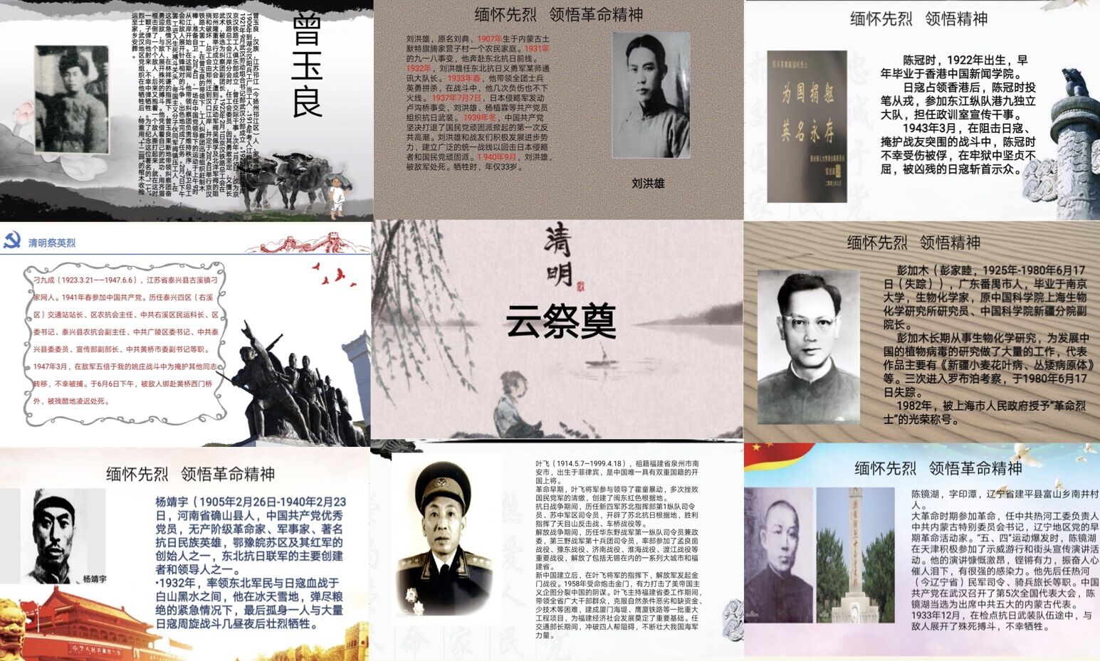 在同学们的介绍和叙述中,有抗战时期在东北与日寇血战到底,弹尽粮绝后英勇就义的杨靖宇将军;有太平洋战争时期,冒着生命危险多次在香港运送党的秘密文件,最终不幸暴露牺牲的陈冠时烈士;有革命时期屡建战功,创建闽东革命根据地,又在建设时期为国家交通运输事业做出巨大贡献的叶飞将军;有15次入疆、3次进入罗布泊地区,为我国边疆自然资源和自然条件科考付出年轻生命的新疆科学院副院长彭加木……