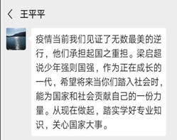 王平平老师说:疫情当前我们见证了无数最美的逆行,他们承担起国之重担。梁启超说“少年强则国强”,作为正在成长的一代,希望将来当你们踏入社会时,能为国家和社会贡献自己的一份力量。