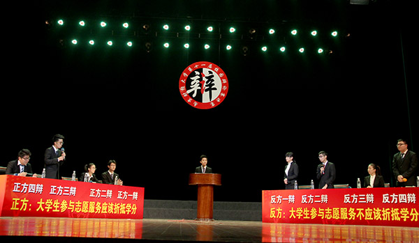 经过初赛、复赛的激烈角逐,我院代表队和法学院代表队“辩”出重围,登上决赛的擂台,围绕“大学生参与志愿服务应不应该折抵学分”这一辩题展开激烈辩论。我院代表队(正方)从大学生的角度出发,从志愿服务抵扣学分有利于大学教育的日益完善、学生综合素质的提高,能激发学生的志愿服务精神、引导更多大学生走上志愿服务岗位等方面分别展开阐述;法学院代表队(反方)则结合“汶川大地震”等具体事例,指出志愿服务折抵学分与志愿精神相违背,将导致志愿服务的形式化。双方辩手你来我往,随机应变,旁征博引,互不相让。随后的质辩环节和自由辩论环节更是将赛事推向高潮,我方辩手机智敏捷、口若悬河而不失风度,反方辩手亦以针尖对麦芒之势步步紧逼、针锋相对。最后,双方进行总结性陈词,双方四辩对己方观点做了深度阐释,展现了出色的口才、良好的风度和敏捷的才思,赢得了现场观众的阵阵掌声。