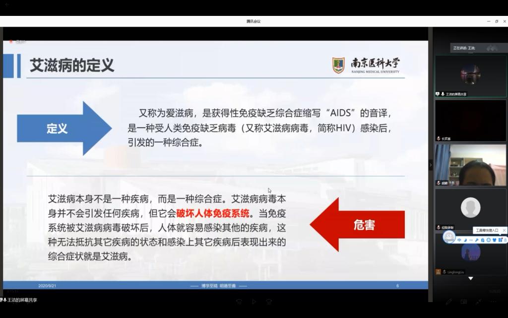 9月21日晚,来自南医大护理学院的“南医微天使”微健康宣讲团应邀为bv1946伟德学生作题为“为艾发声,与爱同行”艾滋病预防科普讲座。讲座由南京医科大学第一附属医院(江苏省人民医院)内分泌科护士长,医学硕士,副主任护师徐晶晶老师指导,宣讲团成员王洁担任主讲,全校共370多名同学在线聆听。