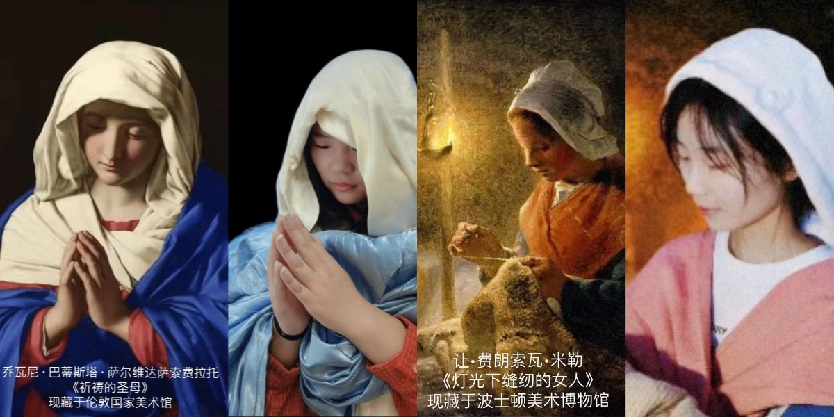 弗雷德里克•巴齐耶的画中晚霞弥漫,夕阳沉寂,妙龄少女着粉裙,扶栏杆,眺前方,同样的静坐远眺,不同的心绪思索,都展现了生命的活力。半闭的双眸,轻握的双手,蓝色披肩,浅黄头巾,同学仅利用生活中常见的物品,就拍摄出了《祈祷的圣母》中宁静安和、善良美好的氛围。一方黄色头巾,一副珍珠耳环,寥寥几个物件,完成了对约翰内斯•维米尔的画作《戴珍珠耳环的少女》的模仿,少女的宁静恬淡、温和似水跃然纸上。