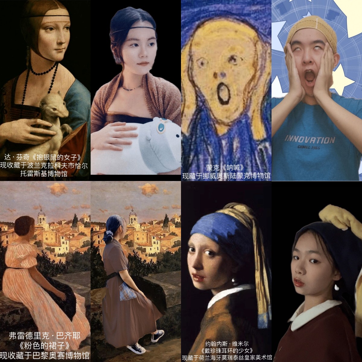 “这幅画名叫《抱银鼠的女子》,是达·芬奇15世纪末创作的一幅木板油画,收藏于波兰的恰尔托雷斯基博物馆,真的好高贵沉静啊!这只小银鼠也是栩栩如生。”“这幅画我知道,是蒙克的《呐喊》,他以讴歌“生命、爱情和死亡”为主题,采用象征和隐喻的手法,揭示了人类“世纪末”的忧虑与恐惧。”本次活动一经发起,就受到了同学们的积极响应,同学们或单独、或组团选定名画,了解作品的画作内容和创作背景,利用日常生活中的小物品做道具,例如毛巾、玩具、口罩、衣服、食物等,模仿名画中人物的形态,拍摄出了一张张脑洞大大、富有创意的名画模仿秀。