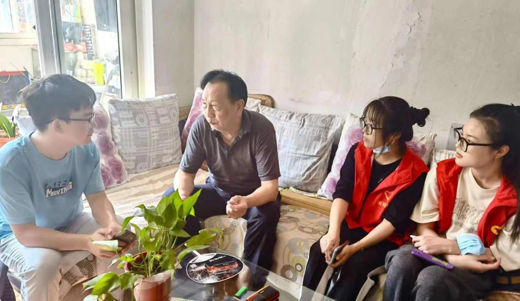 而郭礼宝爷爷一看到志愿者们便露出了和蔼的笑容,将大家热情地迎进了家门。他提到,自己的两个孙子也是大学生,看到志愿者们倍感亲切。随后,郭礼宝爷爷向志愿者们介绍了他平时作为司法调解员的工作感想,鼓励青年们积极服务社会,贡献自我。郭礼宝爷爷还和志愿者们分享了工作中遇到的调节大学生心理的故事,鼓励青年人一定要积极生活,热爱生命。最后,郭礼宝爷爷深情地嘱咐志愿者们:“大家记住要努力学习,报效国家。”