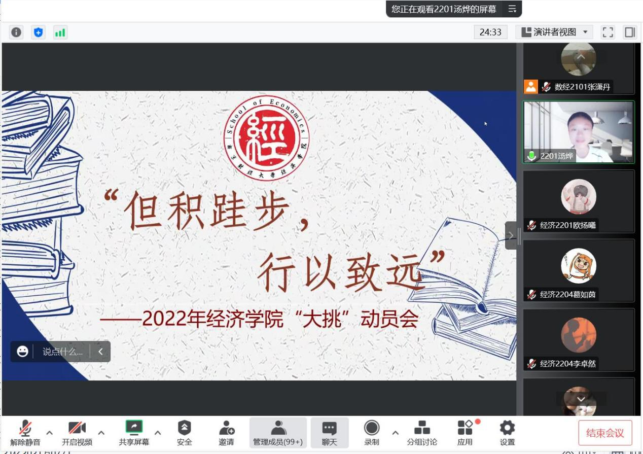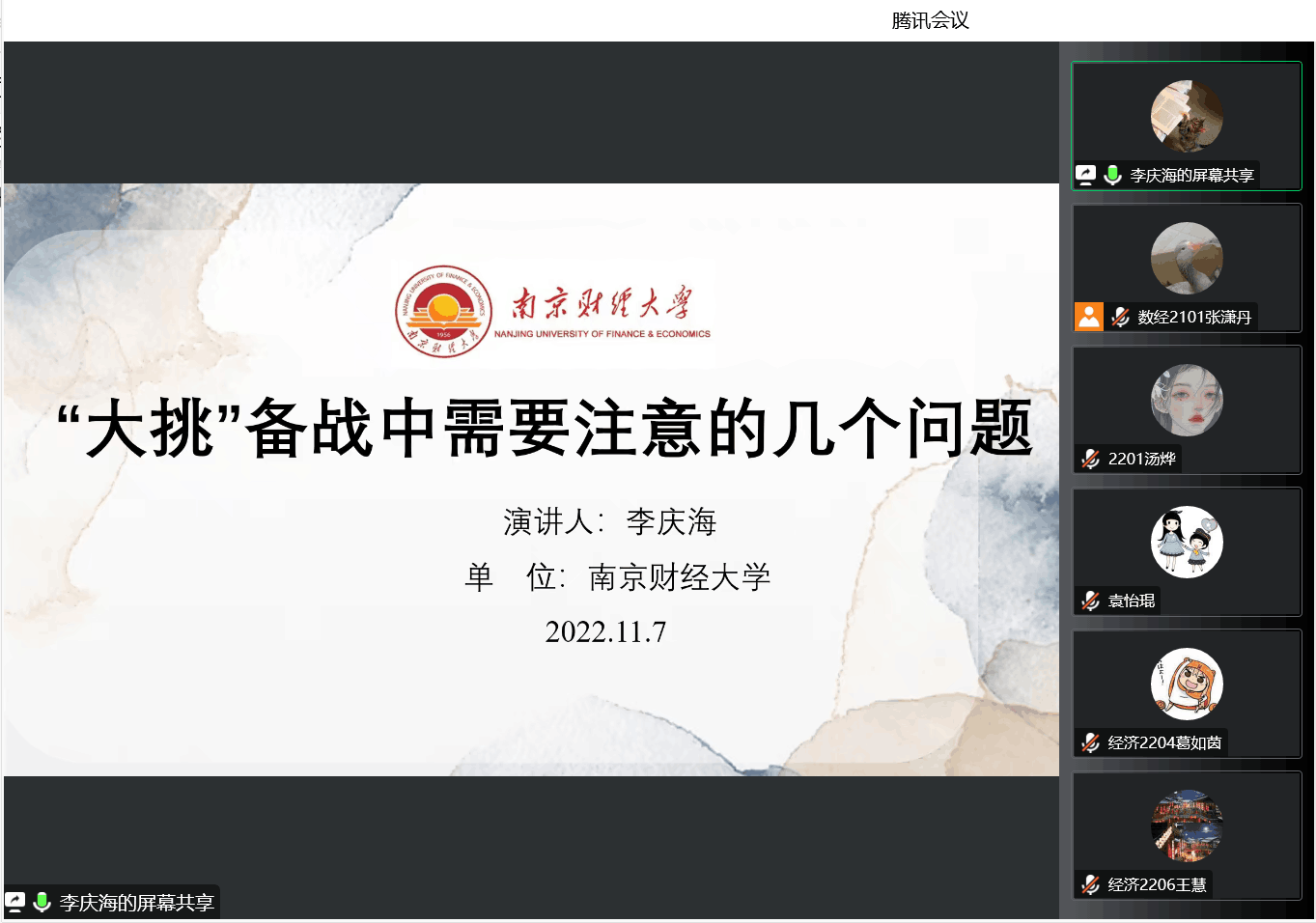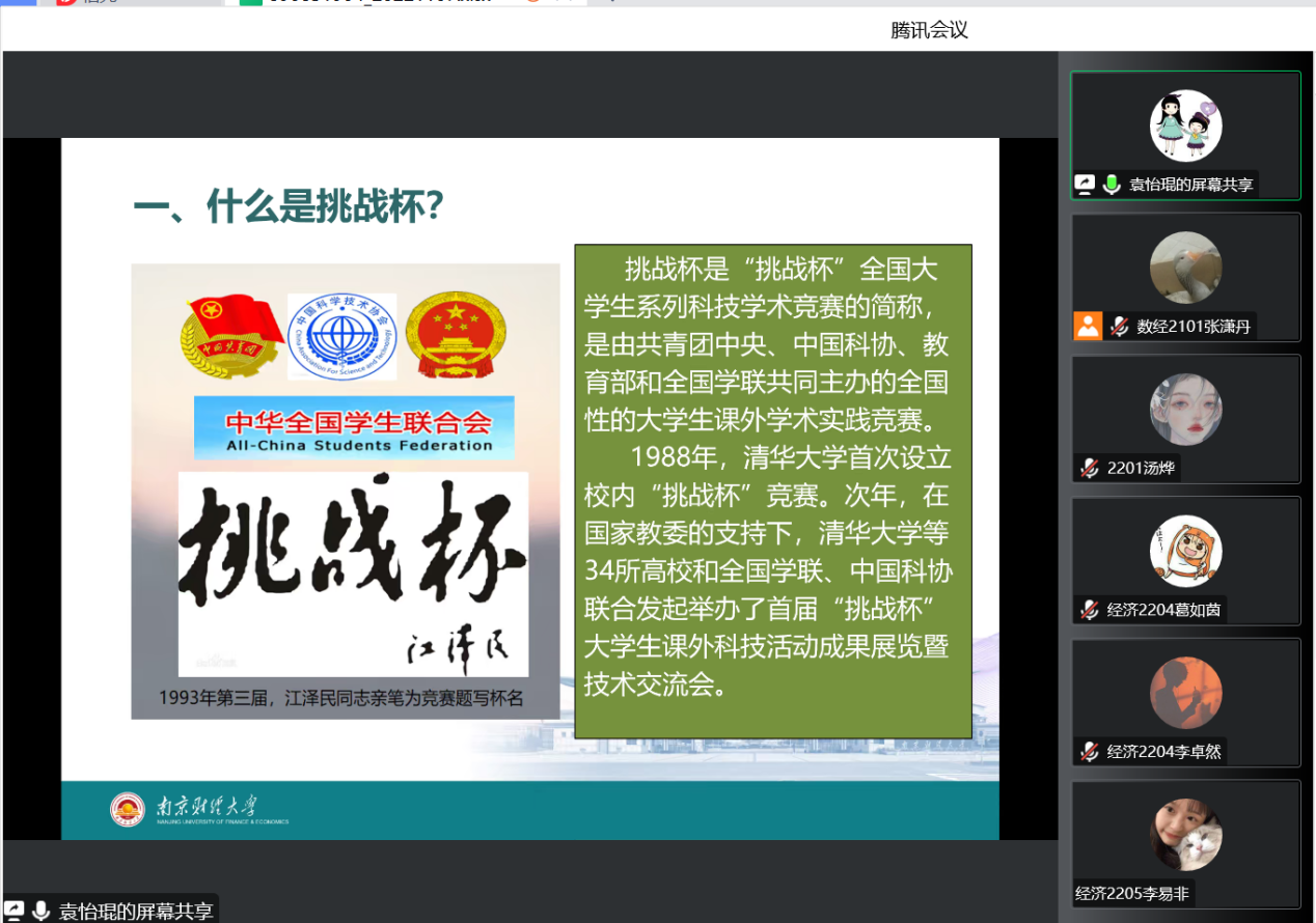11月7日晚,我院于腾讯会议线上举办了以“但积跬步,行以致远”为主题的2022年伟德国际victor·1946源自“挑战杯”全国大学生课外学术科技作品竞赛(简称“大挑”)动员及经验分享会。学院党委副书记袁怡琨老师,统计系副主任、副教授李庆海老师出席会议,数经2001班纪齐和桑海瑞同学作行经验分享,学院各年级同学参加此次动员会。