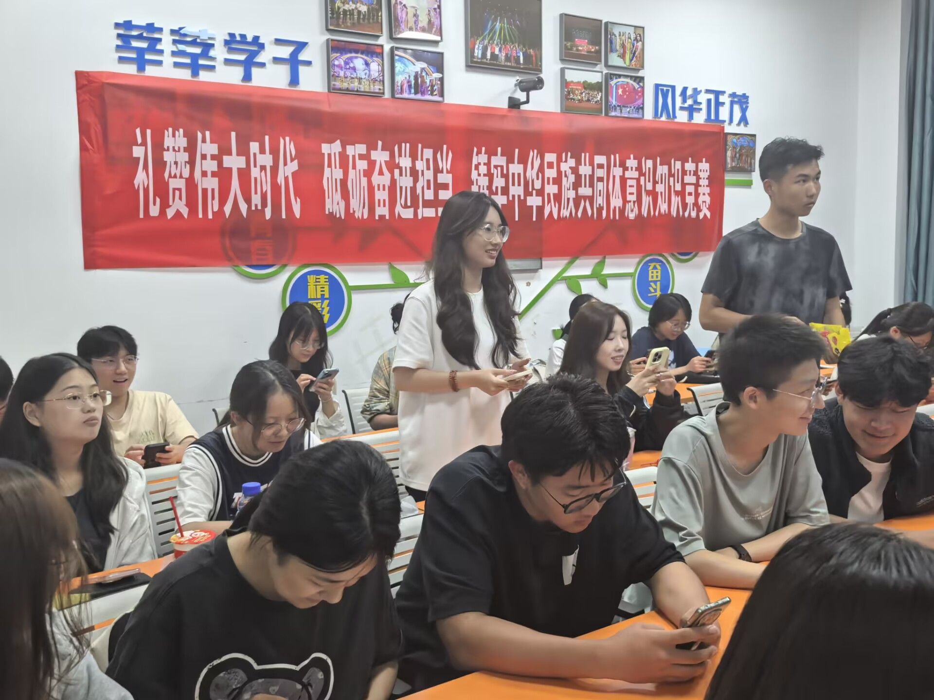 金风送喜,举国同庆。为庆祝新中国75周年华诞,强化中华民族共同体意识,深入学习贯彻党的二十届三中全会精神,贯彻落实习近平总书记关于加强和改进民族工作的重要思想,深入推进民族团结进步宣传教育工作,持续铸牢中华民族共同体意识,9月27日,我院于博文楼104教室开展“礼赞伟大时代,砥砺奋进担当,铸牢中华民族共同体意识”知识竞赛。活动通过集中授课和知识竞答相结合的方式,学习贯彻习近平总书记关于加强和改进民族工作的重要思想,开展党的民族政策法规宣传教育,大力营造爱党爱国爱社会主义的浓厚节庆氛围。本次活动由2024级本科生辅导员张闻老师主讲团课,部分大一、大二学生参与活动。