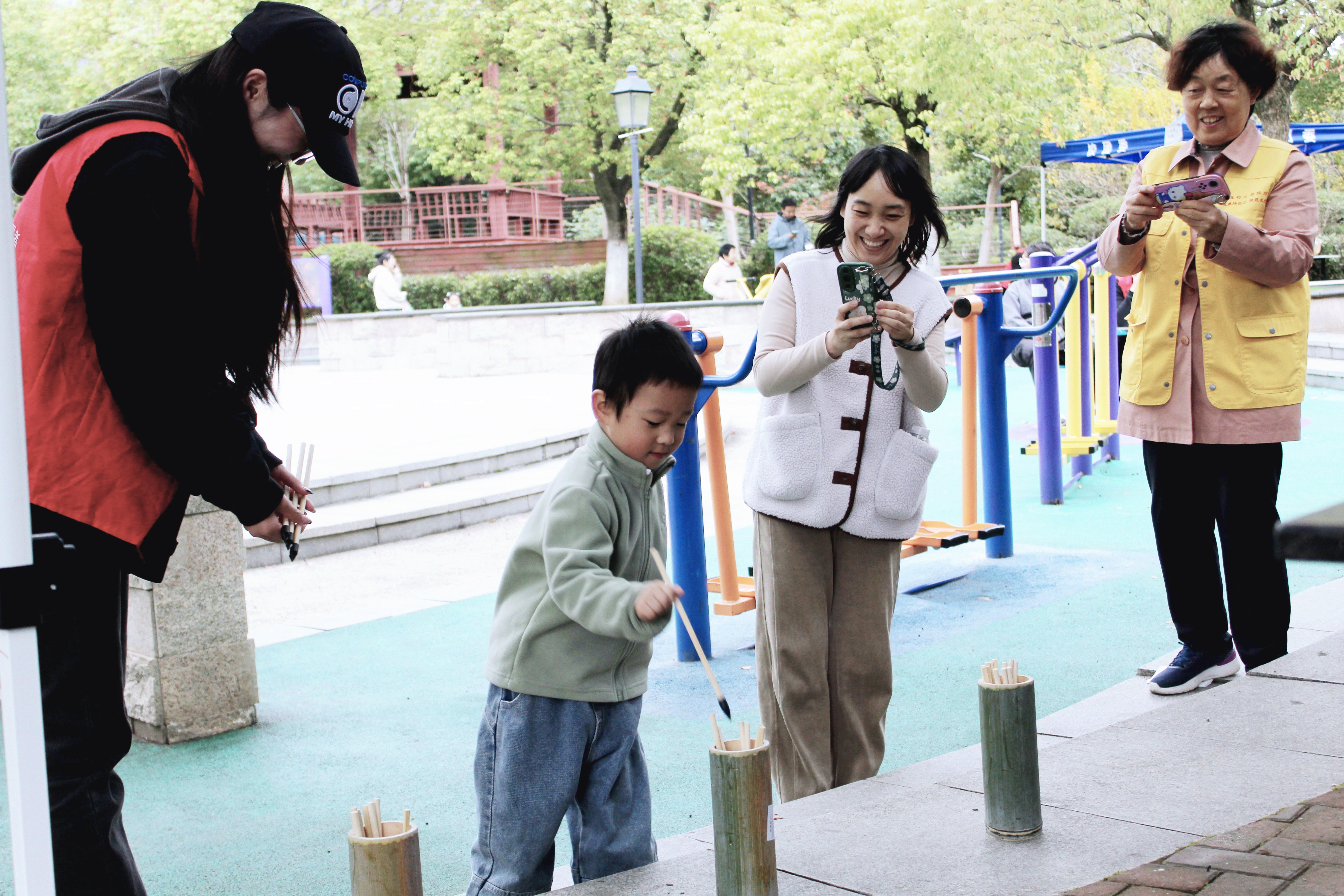 秋日游园会以一系列精彩纷呈的项目设置为参与者们呈现了一场传统文化的盛宴。投壶、京剧脸谱制作、漆扇扎染、中国结编织、书签创作及古诗词问答等项目交相辉映。得益于志愿者们的广泛宣传与细致讲解,活动吸引了众多居民与孩童的热情参与。投壶游戏前,孩童们排队参与,箭矢在空中划出一道道优美的弧线,令人在传统游戏中感受到中华文化的深厚底蕴。京剧脸谱制作区,志愿者们悉心指导,参与者们笔下生辉,色彩斑斓的脸谱彰显了京剧艺术的独特韵味。书签创作环节同样备受青睐,参与者们以绘画与书法为媒,创作出一个个蕴含深厚文化底蕴的书签。古诗词问答环节更是将文化氛围推向高潮,孩子们在家长与志愿者的鼓励下,流利背诵《悯农》《咏鹅》《山居秋暝》等经典诗作,展现出对中华古诗文化的浓厚兴趣与热爱,让这场秋日游园会成为了一次难忘的文化之旅。