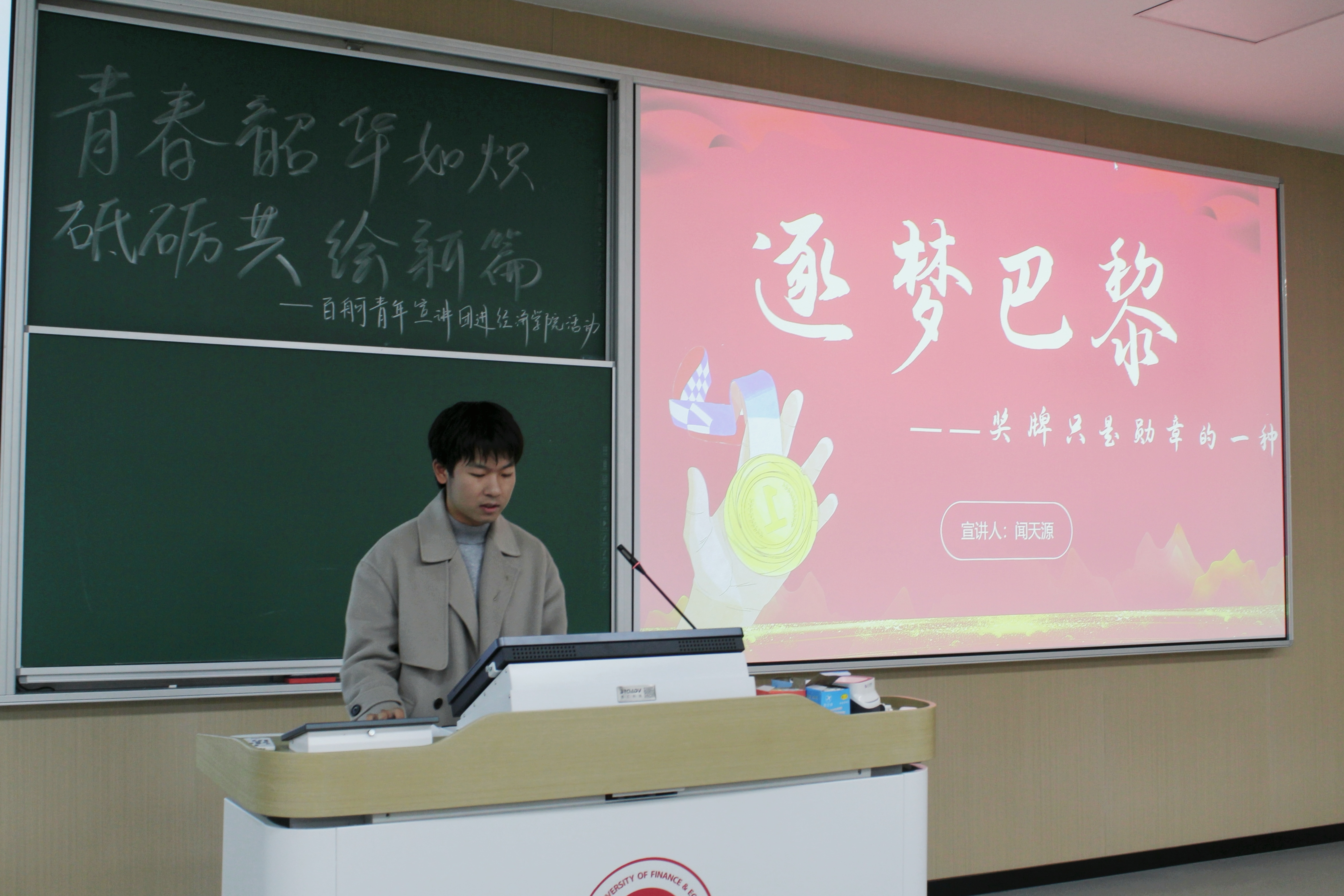 最后,百舸青年宣讲团成员闻天源同学以巴黎奥运会为背景展开宣讲,通过分享体育界樊振东、潘展乐等青年运动员在奥运赛场上奋勇拼搏、为国争光的故事,诠释了青年热血的逐梦精神与顽强拼搏的毅力,以奥运精神激励青年不断挑战自我、追求卓越。