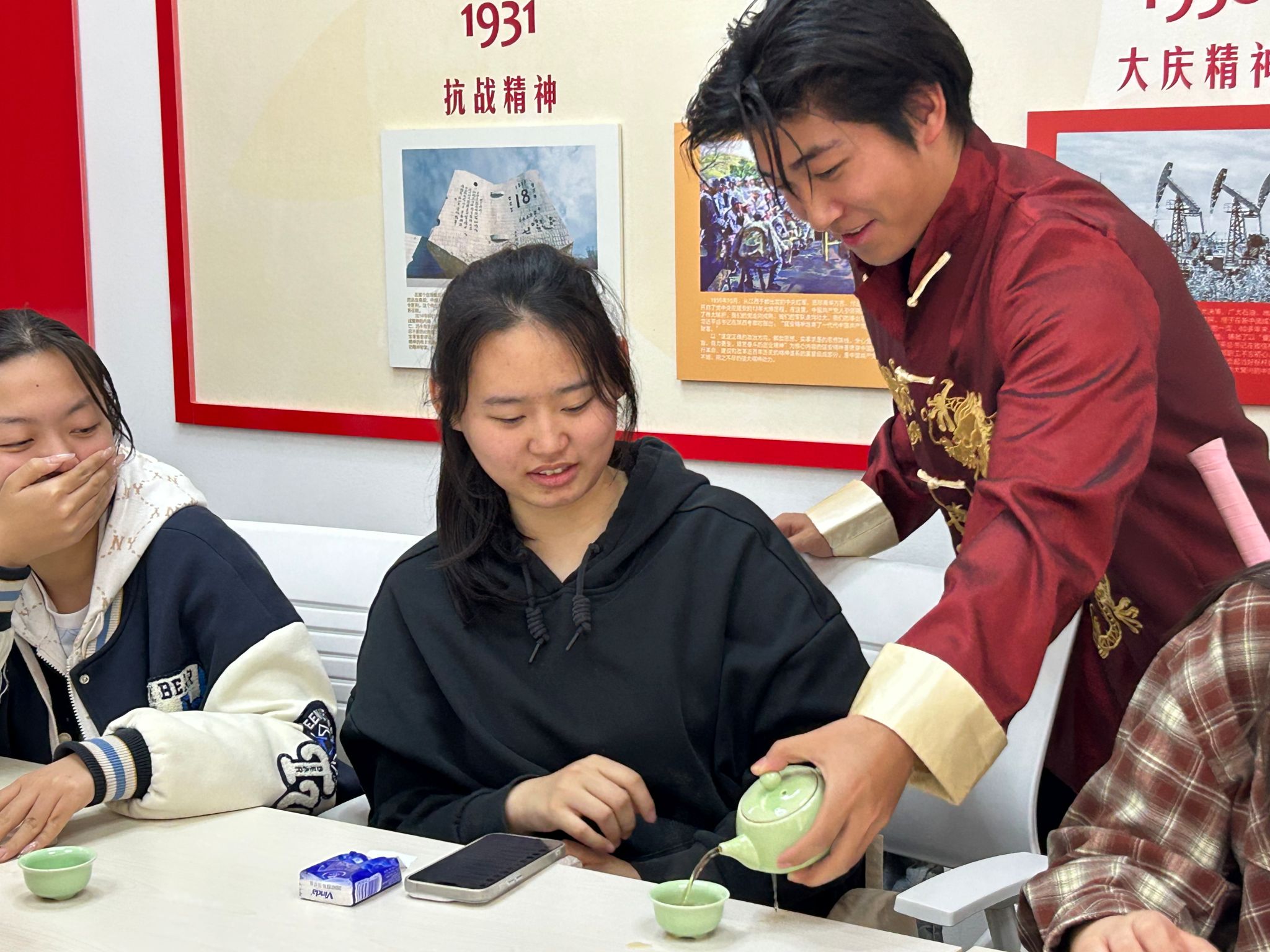 现场还设置了“闻茶香识茶”的互动环节,学生会成员将不同茶叶装入闻香杯,打乱顺序后分发。同学们轻嗅杯中的茶香,有的微微皱眉仔细分辨,有的与同伴小声交流讨论。紧接着,泡好的茶汤端上桌,同学们依次品味热香与冷香,不少同学凭借敏锐的嗅觉和主持人讲解的知识,准确说出茶叶品种,现场掌声不断。