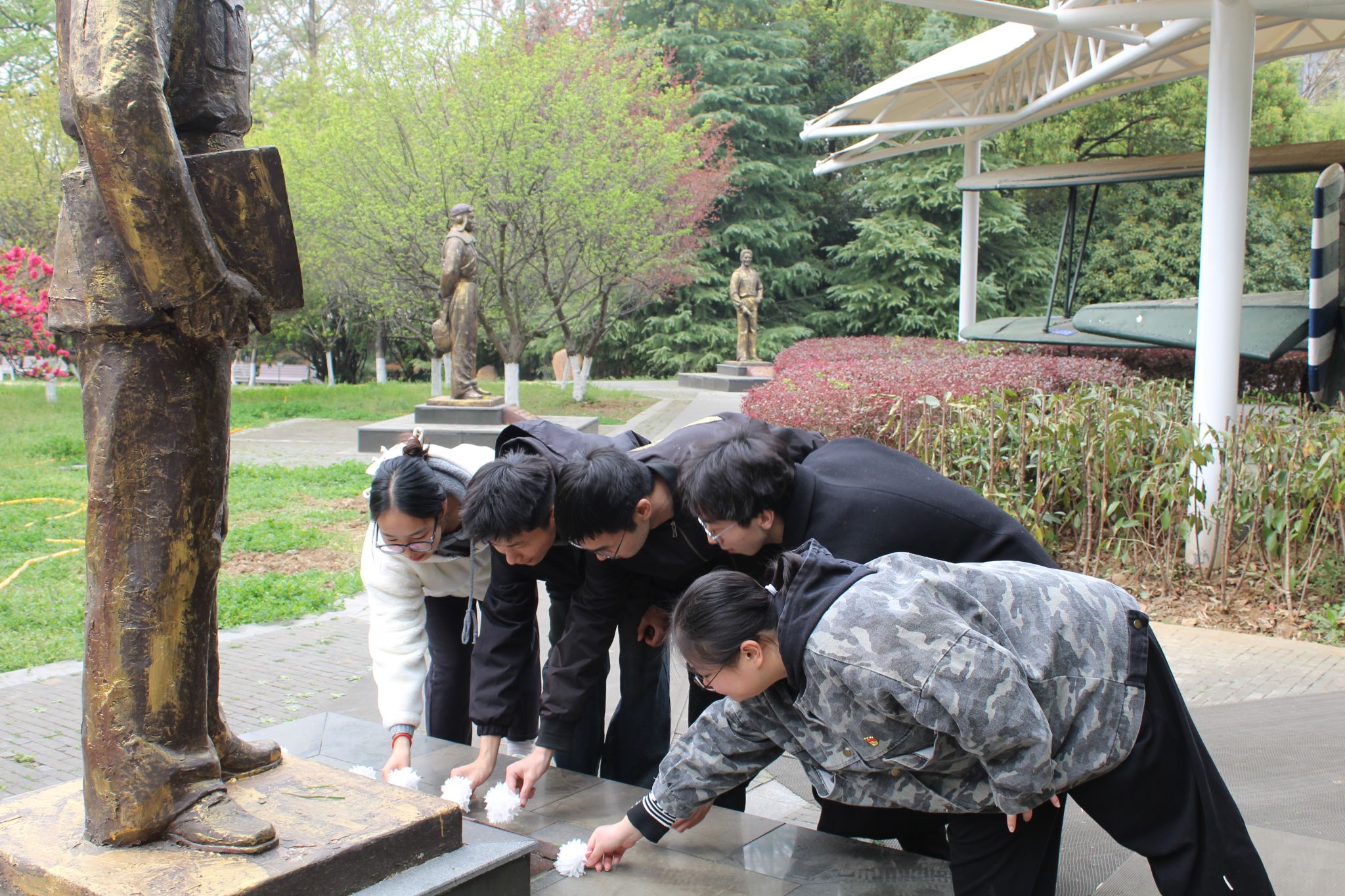 追寻历史印记,赓续精神血脉。当日下午,师生前往南京抗日航空烈士纪念馆,深切缅怀抗战时期为国捐躯的航空英烈。馆内陈列的抗战时期飞行装备、烈士遗物及1:1复原的战斗机模型,让学员们触摸到笕桥空战的历史脉搏。数经2301班徐逸邈作为学员代表,动情讲述“空军战神”高志航的英勇事迹,号召大家铭记先烈以弱胜强的无畏精神,坚定笃学报国之志。在庄严肃穆的献花仪式中,学员们手持白菊,列队缓步走向烈士纪念碑,鞠躬致敬、寄托哀思。苍松翠柏间,先烈视死如归的豪迈气概与青年学子昂扬向上的精神风貌交相辉映。