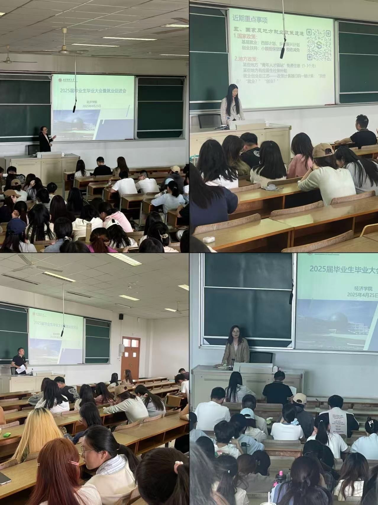 首先,潘怡老师向学生们讲解2025届毕业生毕业事宜,内容丰富,包含毕业必备条件、毕业实习、毕业论文等多个关键事项。潘怡老师从多个方面、多个维度对国家及地方就业政策、就业材料、毕业季防诈骗进行耐心讲解,台下同学认真听取并积极互动、提出自己的疑惑与不解,潘怡老师进行一一解答。