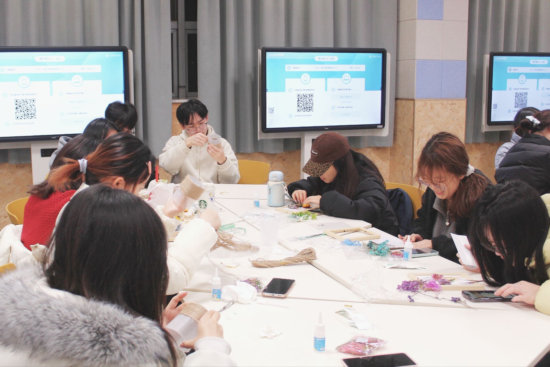 伴着温馨愉悦的节日氛围,创意手工环节有序开展。活动设置风铃、干花、香薰、串珠四大类别,为同学们提供多元实践体验。干花组的同学精心挑选花材、搭配色彩,将自然之美定格于相框与笔筒。串珠组的同学则对照教程,认真搭配珠串造型与配色,制作出精致手链。创作过程中,同学们全情投入、大胆创新,将巧思与匠心融入作品,一件件独具创意的手工作品相继完成。