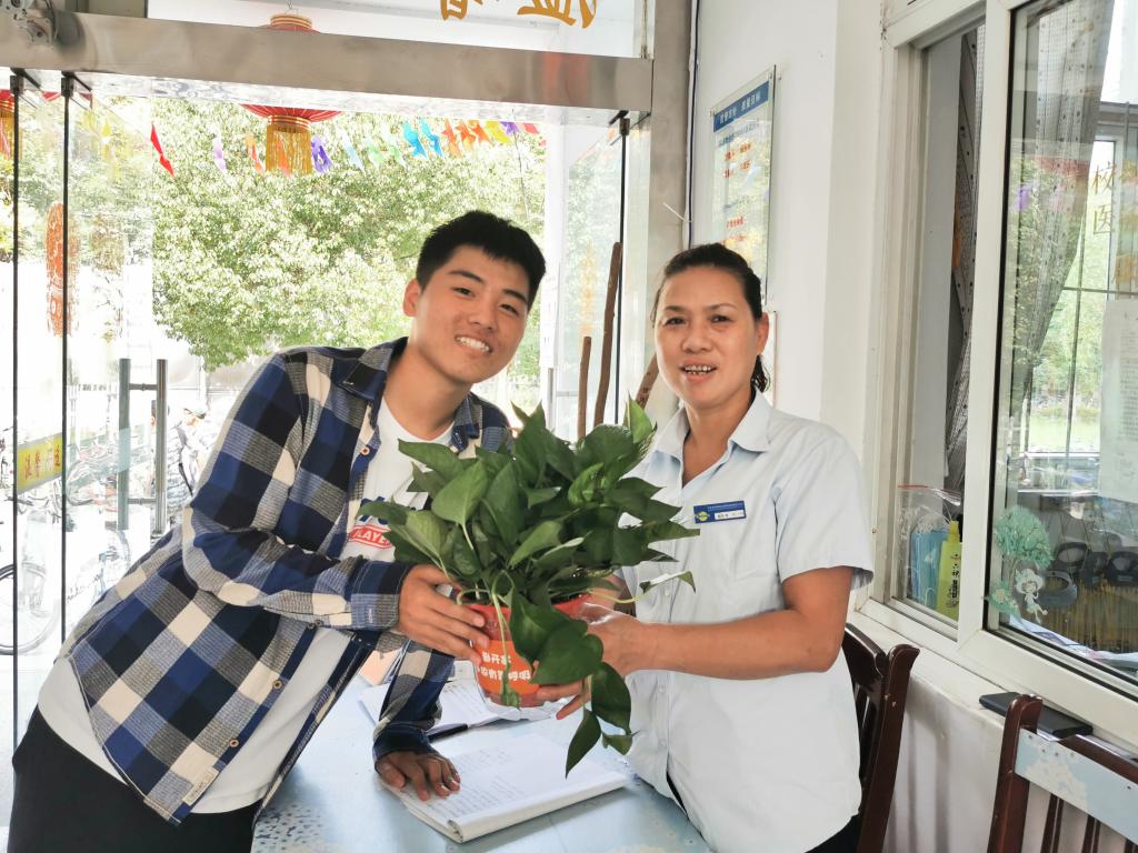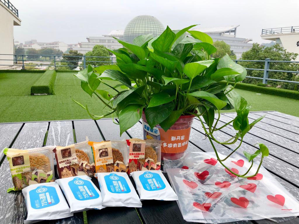 国庆和中秋佳节在即,为了让刚入校的2020级新生欢度更快适应环境、欢度大学里的第一个节日,感受到来自学院的温暖,9月23日中午,我院党委副书记袁怡琨老师、学工秘书尹海燕老师、新生辅导员陶海韵老师和院学生会的同学们来到学生宿舍,为每个小寝送上绿萝,并为每个新生带来中秋月饼、消毒湿巾等节日礼品。