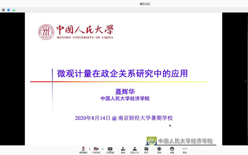 8月14日下午,中国人民大学聂辉华教授为暑期学校的学员们作了题为“微观计量在政企关系研究中的应用”的专题讲座。讲座由我院崔向阳教授主持,暑期学校全体学员以及我校部分青年教师参加了讲座。