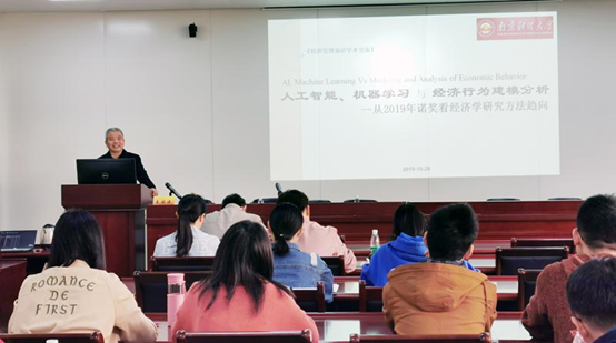 10月29日,中国社会科学院数量经济技术经济研究所王国成研究员在我校仙林校区德经楼307会议室作了题为“人工智能、机器学习与经济行为建模分析——从2019年诺奖看经济学研究方法趋向”的报告。报告由我院统计学学科带头人白先春教授主持,韩中副教授、孙瑞博副教授、周宁副教授、康宁副教授、詹鹏博士等中青年教师和部分研究生参加了讨论。