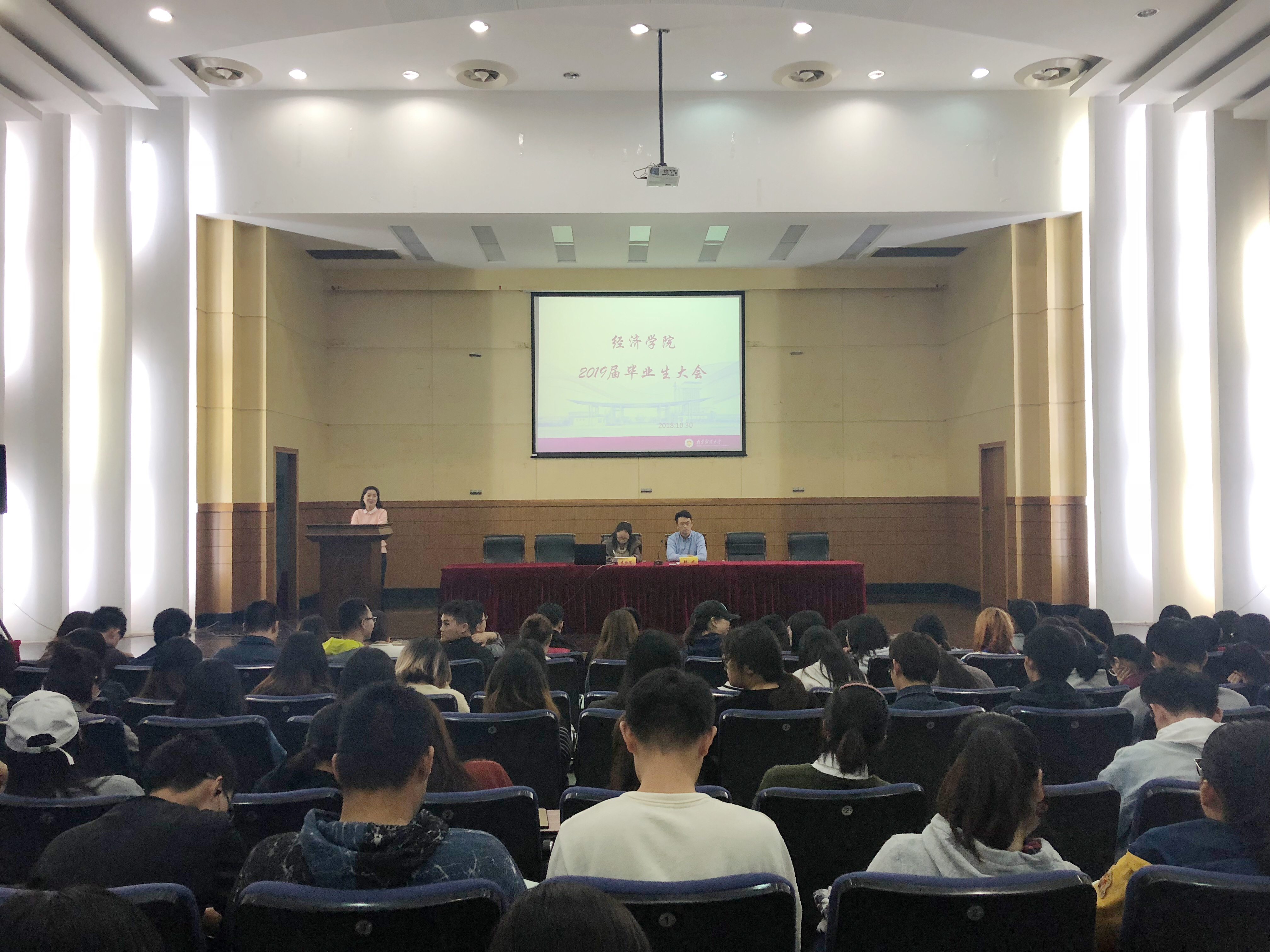 10月30日下午,我院在德济楼报告厅召开2019届毕业生大会。副院长张成、党委副书记袁怡琨、学工秘书尹海燕、毕业生辅导员徐昊翔及2019届全体毕业生参加此次大会。