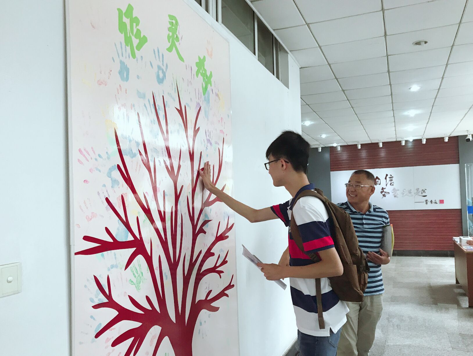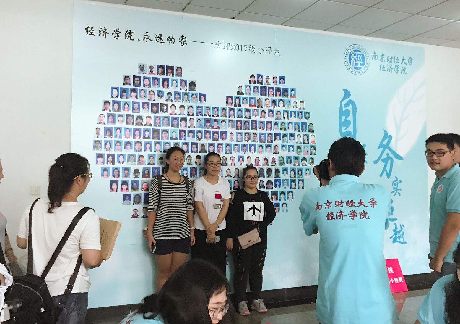 新生报到处同时设有新生“心形墙”,新生可以从近300张照片中找到自己,站在我校校训“自谦 自信 务实 超越”旁拍照留念。