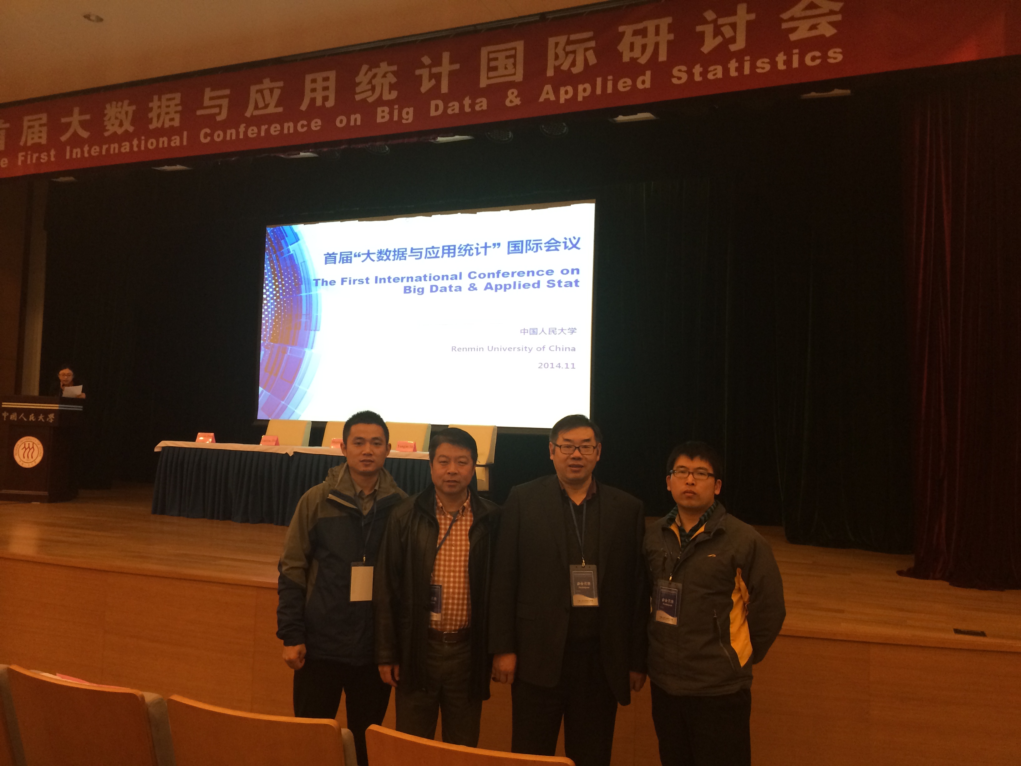 2014年11月28日至30日,首届“大数据与应用统计” 国际会议在中国人民大学召开,我院副院长(主持工作)陈耀辉教授、统计学一级学科带头人李刚教授、统计系副主任韩中博士、统计系周朋朋博士等一行四人应邀出席。此次会议由教育部人文社科重点研究基地中国人民大学应用统计科学研究中心、中国人民大学统计学院、兰州商学院统计学院、中国科学院数学与系统科学研究院、北京大学光华管理学院和首都师范大学数学科学学院承办,会议组委会邀请了来自哈佛大学、耶鲁大学、普林斯顿大学、中国人民大学等国内外知名学府的多名统计领域的专家参加此次会议,参会总人数400余人。