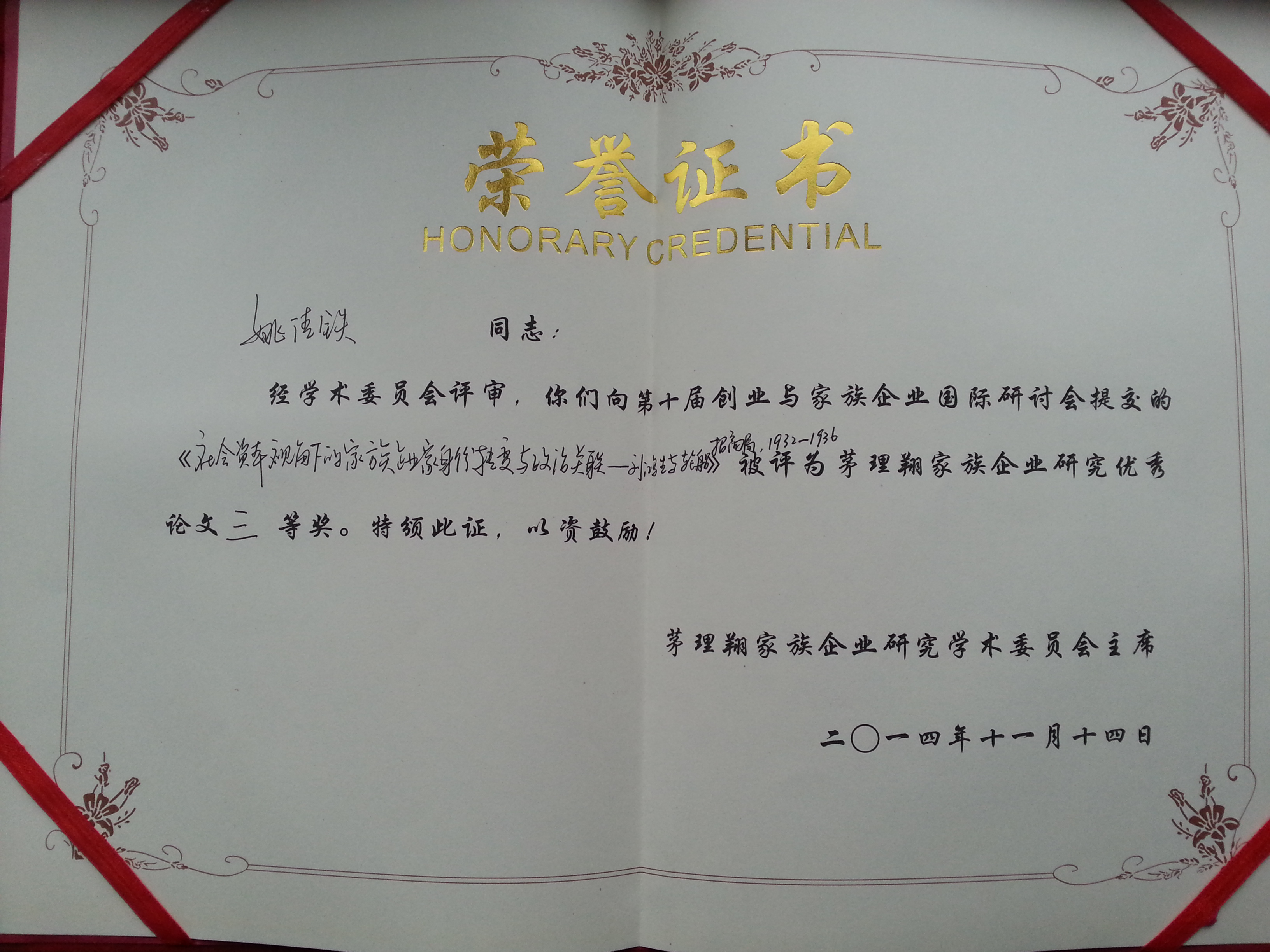 在日前举行的第十届创业与家族企业国际研讨会上,2014年度茅理翔家族企业研究奖获奖名单揭晓,我院经济系教师姚清铁博士提交的论文《社会资本视角下的家族企业家身份转变与政治关联——刘鸿生与轮船招商局,1932-1936》获得论文三等奖。