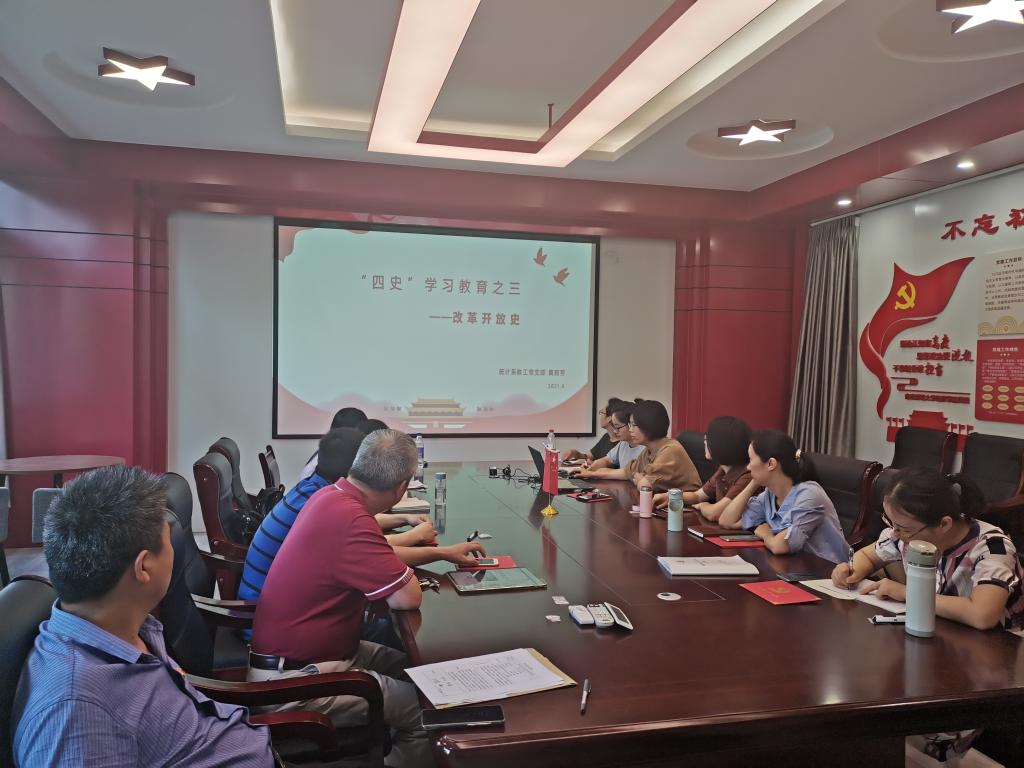 接下来,统计系教工党支部书记黄莉芳同志以“四史学习教育之三——改革开放史”为主题讲授专题党课。黄书记首先从内容、时间和整体等角度对四史之间的关系进行了解读。接下来分别从改革开放的历史回顾、成就展示、成功原因、问题聚焦和未来思考五个方面讲述了改革开放的历史。在历史回顾部分,以四十多年前的小岗村的民生变迁为例回顾了改革开放以来的大事。从社会生产力高速发展、经济质量显著提升、科学技术日新月异、文化事业繁荣发展、人民生活水平极大提高、民生改革阔步前进等方向展示了改革开放的成就。接下来,黄书记具体分析了改革开放成功的原因和目前面临的问题,并说明了未来的思考与发展方向。