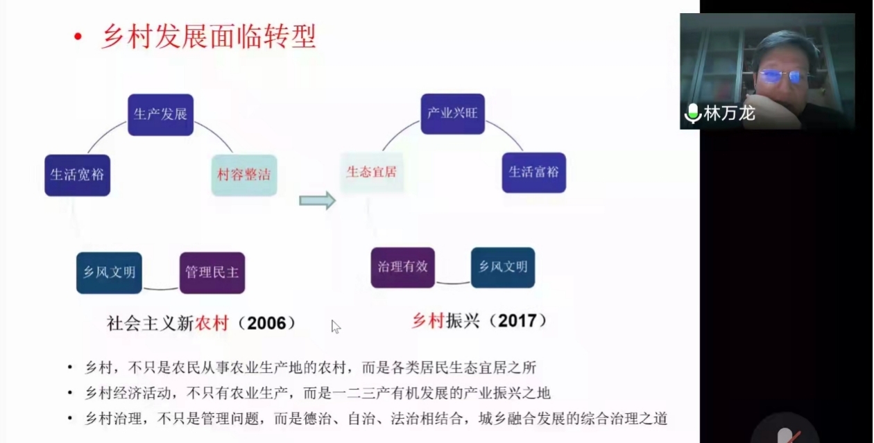 接着,林万龙教授分析了乡村振兴战略的内涵与着力点。他从产业结构等方面阐述中国农业发展模式正在发生重大变化,从社会主义新农村到乡村振兴,乡村发展正面临转型,要跳出对农业的传统理解来把握乡村农业新业态。林教授提出全面实施乡村振兴战略要抓好两个“底线”、做好两个“衔接”、促进两个“融合”。对于如何从脱贫攻坚过渡到乡村振兴,林万龙教授提出设立衔接过渡期、逐项分类优化调整等措施,以实现巩固拓展脱贫攻坚成果同乡村振兴的有效衔接。