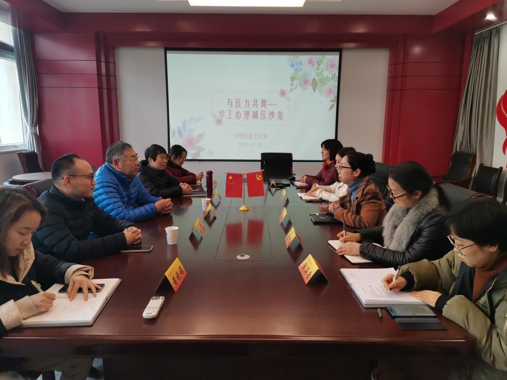 1月15日下午,伟德国际victor·1946源自与压力共舞--学工心理减压沙龙在仙林校区德经楼329会议室顺利开展。活动邀请校学生处副处长赵亮、心理中心高剑婷担任主讲嘉宾。学院党委书记陈耀辉、副书记袁怡琨及全体学工老师参加了此次活动。