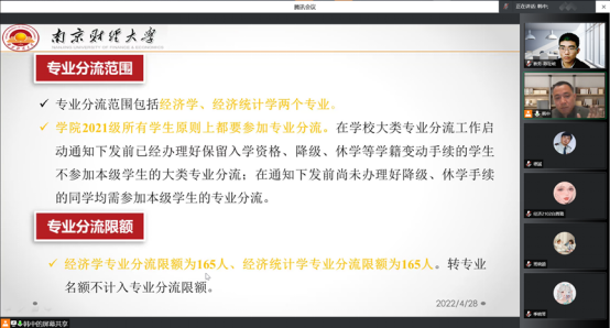 为了加深学生对学院本科专业的了解,帮助学生通过专业分流、方向班选拔选择适合自己的专业和方向,确保学院2021级本科生专业分流、方向班选拔等各项工作有序推进。学院于2022年4月29采用腾讯会议形式举办了“伟德国际victor·1946源自2021级本科生专业分流宣讲会”。会议由学院副院长韩中主持,学院党委副书记袁怡琨,统计系主任程恭品、经济系主任陈杰、统计系王庚教授、经济系章莉教授、辅导员梁少颖、班主任吴昊、教学秘书陈祉岐以及学院部分教师和院内外2021级本科生参加了会议。