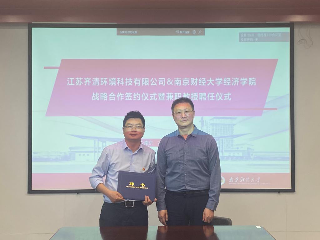 最后,朱红根院长与王志良董事长签署了《伟德国际victor·1946源自与江苏齐清环境科技有限公司战略合作协议》《伟德国际victor·1946源自与江苏齐清环境科技有限公司实习就业基地共建协议》,并聘任王志良董事长、李建军副总经理为绿色经济发展研究院兼职教授。根据协议,双方将在碳经济与管理交叉学科人才培养、师资队伍建设,碳经济理论与实践研究,流域环境治理、生态环境政策咨询,实习就业基地建设等方面开展深入合作。