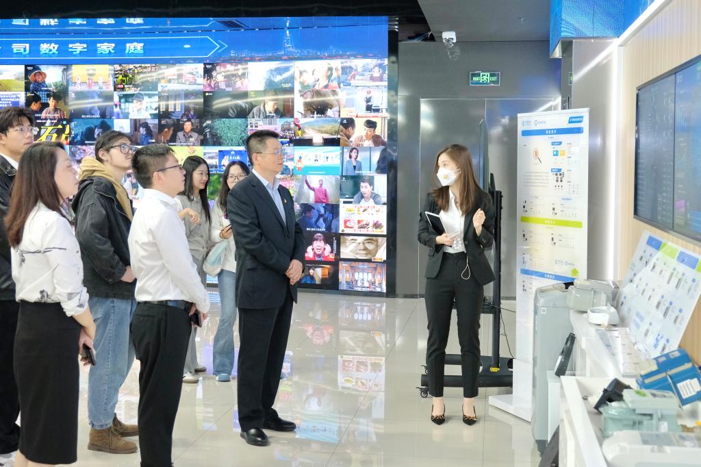 向军主任和陆放总经理对我院师生的到来表示热烈欢迎,陪同张圣兵书记一行参观了江苏移动创新展示体验中心。中心围绕中国移动通信集团“连接+算力+能力”战略方针,综合展示了江苏移动赋能各行业数智化转型的应用,详细展现了数智化赋能下产业升级的澎湃动力。
