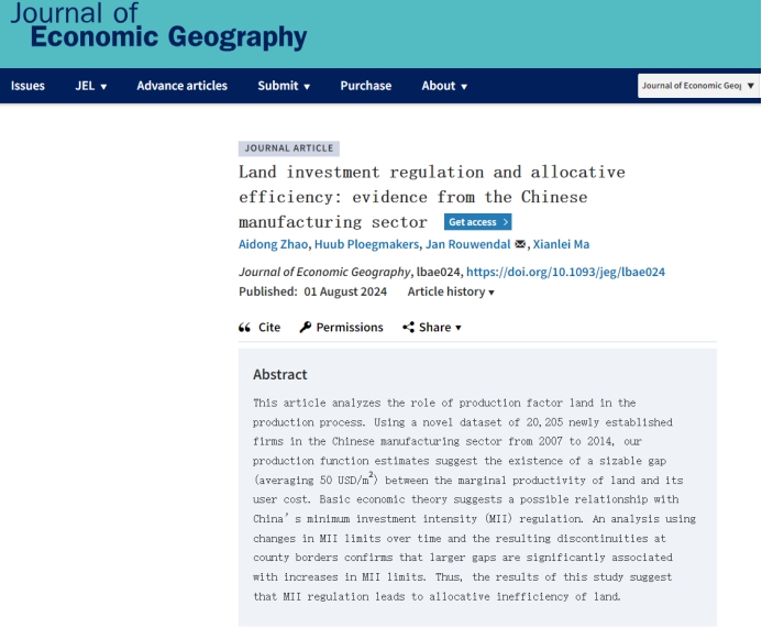 近日,我院赵爱栋博士与荷兰阿姆斯特丹自由大学等学者的合作论文“Land investment regulation and allocative efficiency: Evidence from the Chinese manufacturing sector”被城市与区城经济学国际顶级期刊Journal of Economic Geography正式接受发表。伟德国际victor·1946源自为第一署名单位,赵爱栋博士为第一作者。