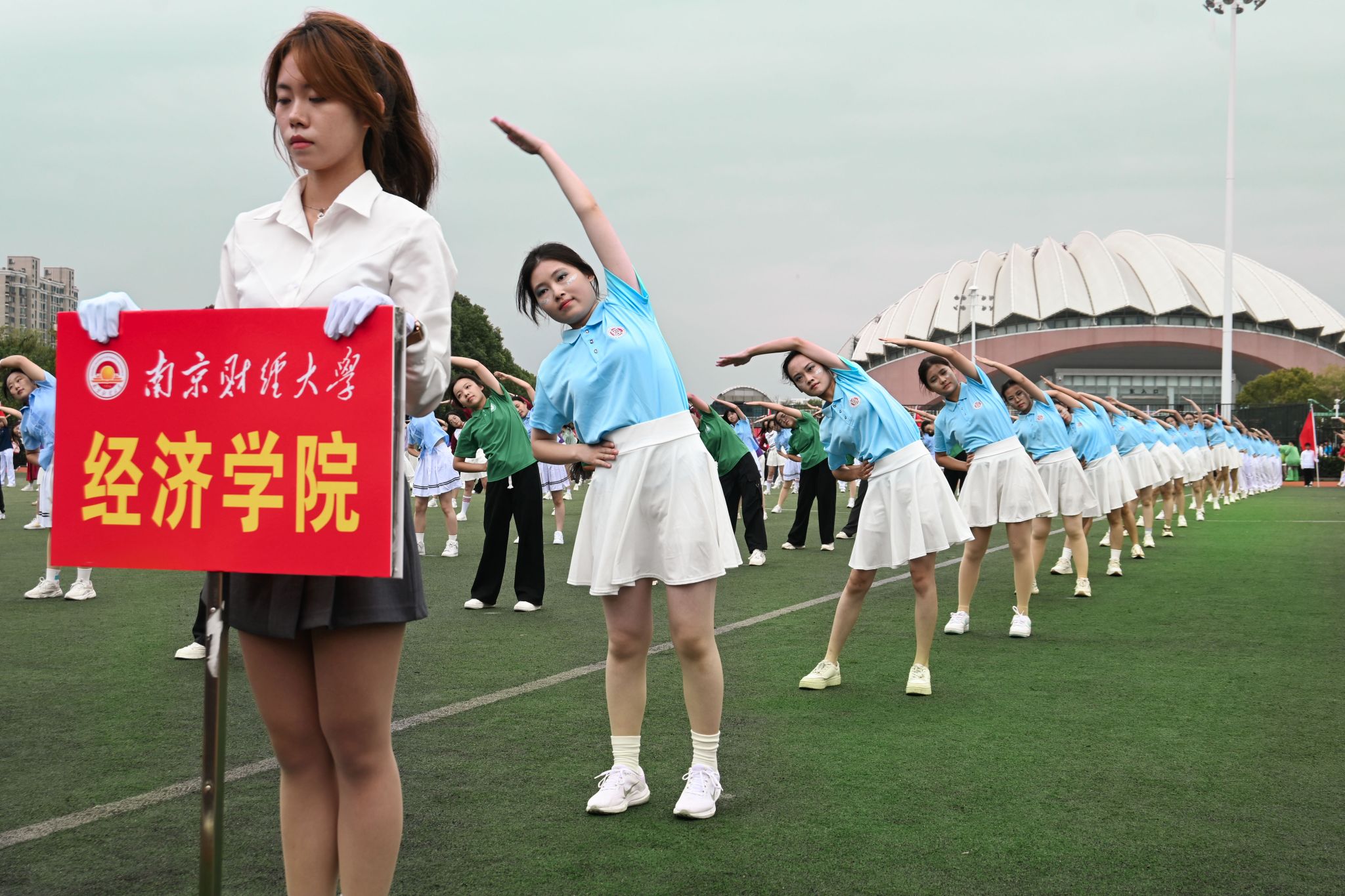振奋人心的方阵表演结束后,紧接着就是广播操表演。随着第九套广播体操的伴奏响起,我院广播操选手们脸上洋溢起自信阳光的笑容。他们的动作整齐有力,步伐活力四射,尽情展现着经院学子的意气风发。