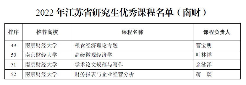据悉,为切实提升我省研究生教育质量,省教育厅组织开展了2022年江苏省研究生优质教学资源(含研究生优秀课程、优秀教材和优秀教学案例)评选工作。经高校推荐、省研究生教指委评选、省教育厅审定等程序,本次共评选出100门研究生优秀课程、50部研究生优秀教材、100个研究生优秀教学案例。我校此次共入选4门研究生优秀课程、2部研究生优秀教材、2个研究生优秀教学案例,我院《高级微观经济学》课程能成功入选省优秀课程,充分展示了近年来我院研究生工作的明显成效。