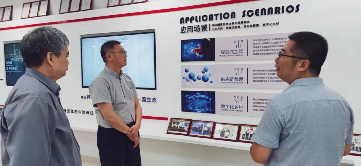 中诚区块链研究院汪洋总经理对我院领导的到来表示热烈欢迎,并带领朱红根院长一行参观了中诚区块链研究院(南京)有限公司展厅,详细介绍了中诚区块链研究院的发展背景、基本情况及在金融监管、数字农业方面的应用场景。