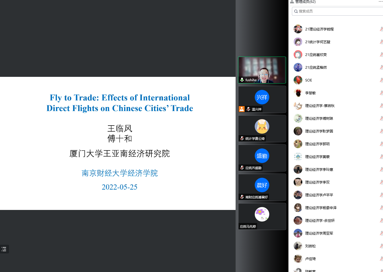 5月25日下午,厦门大学王亚南经济研究院傅十和教授,在线为我院师生做了题为“Fly to Trade: Effects of International Direct Flights on Chinese Cities’ Trade”的学术报告。报告由我院温兴祥老师主持,学院部分师生参与。