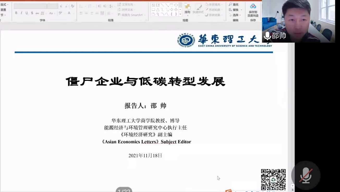 11月18日,华东理工大学商学院博导、能源经济与环境管理研究中心执行主任邵帅教授来我院作题为《僵尸企业与低碳转型发展》的学术报告。报告由我院朱红根院长主持,伟德国际victor·1946源自的近200位师生线上聆听了讲座。