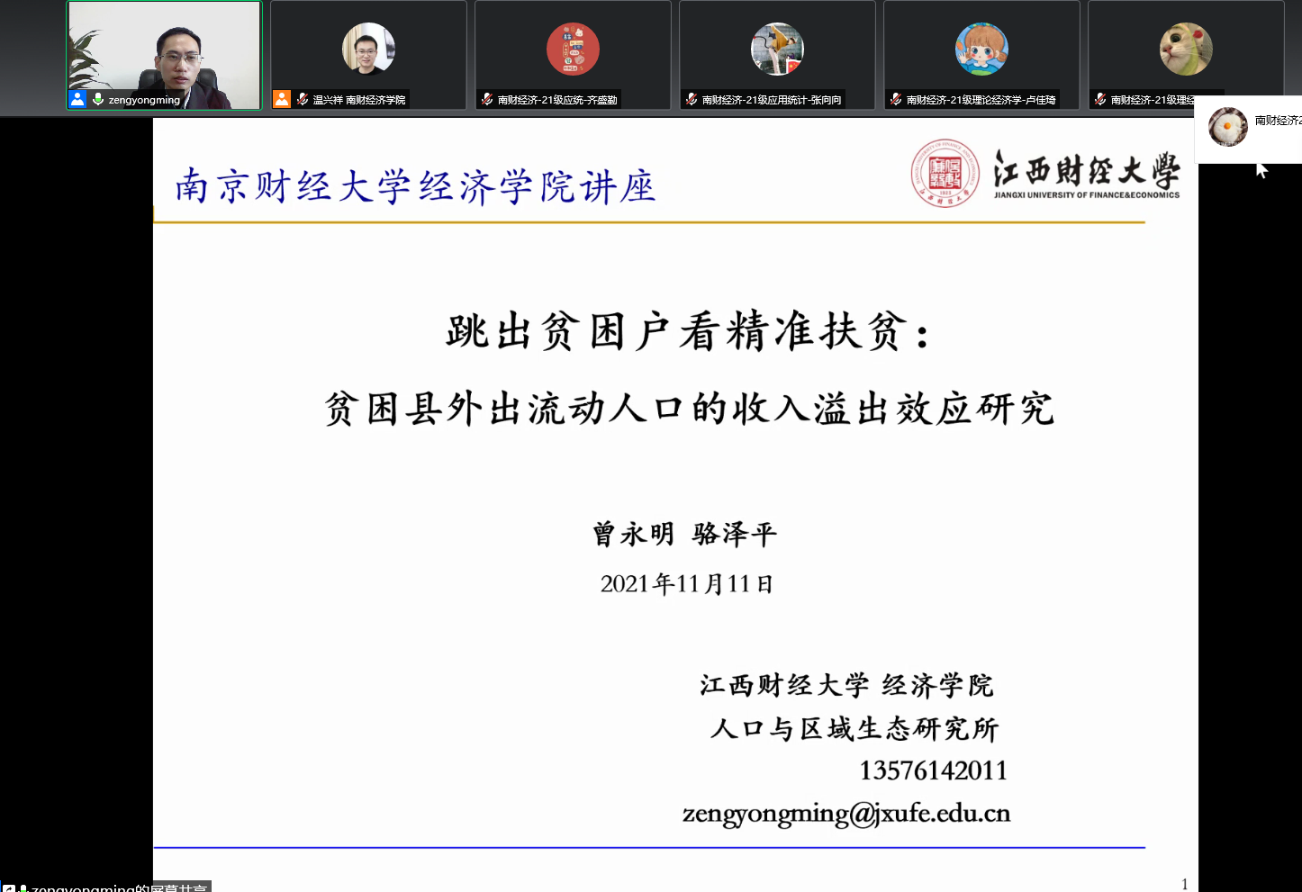 11月11日上午,应我院邀请,江西财经大学伟德国际victor·1946源自曾永明副教授在线为我院师生作了题为“跳出贫困户看精准扶贫:贫困县外出流动人口的收入溢出效应研究”的学术报告。报告由学院温兴祥老师主持,学院部分教师和研究生参与了此次讲座。