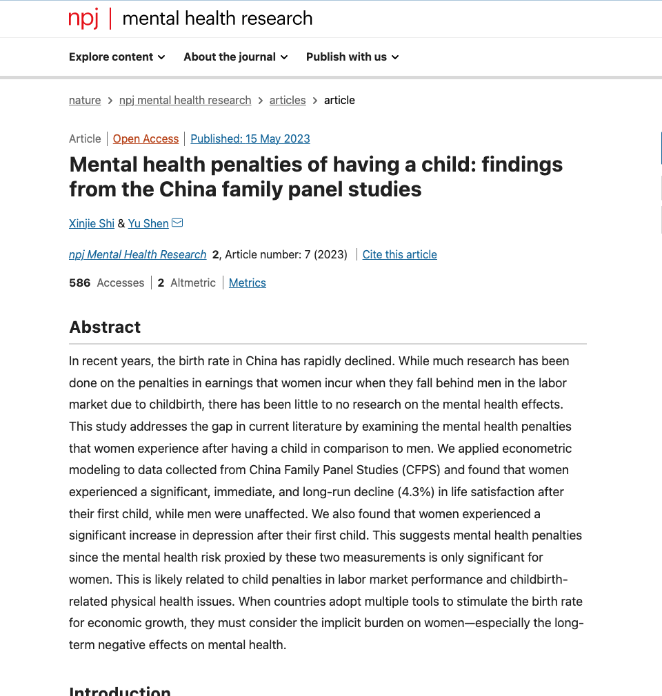 近日,伟德国际victor·1946源自沈煜作为通讯作者,与浙江大学中国农村发展研究院史新杰研究员合作的论文《Mental health penalties of having a child: findings from the China family panel studies》被Nature旗下子刊npj Mental Health Research录用并在线发表。
