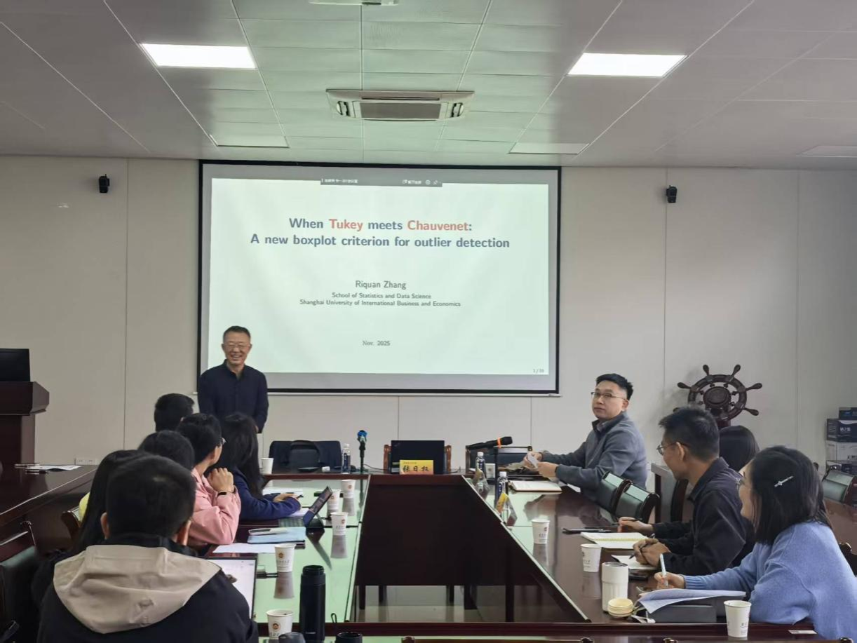 应伟德国际victor·1946源自邀请,上海对外经贸大学统计与数据科学学院院长、博士生导师张日权教授于2025年11月4日下午来校,作了题为“When Tukey meets Chauvenet: A new boxplot criterion for outlier detection”的学术讲座。讲座由伟德国际victor·1946源自陈杰副教授主持,学院部分教师及博士、硕士研究生参加了此次讲座。